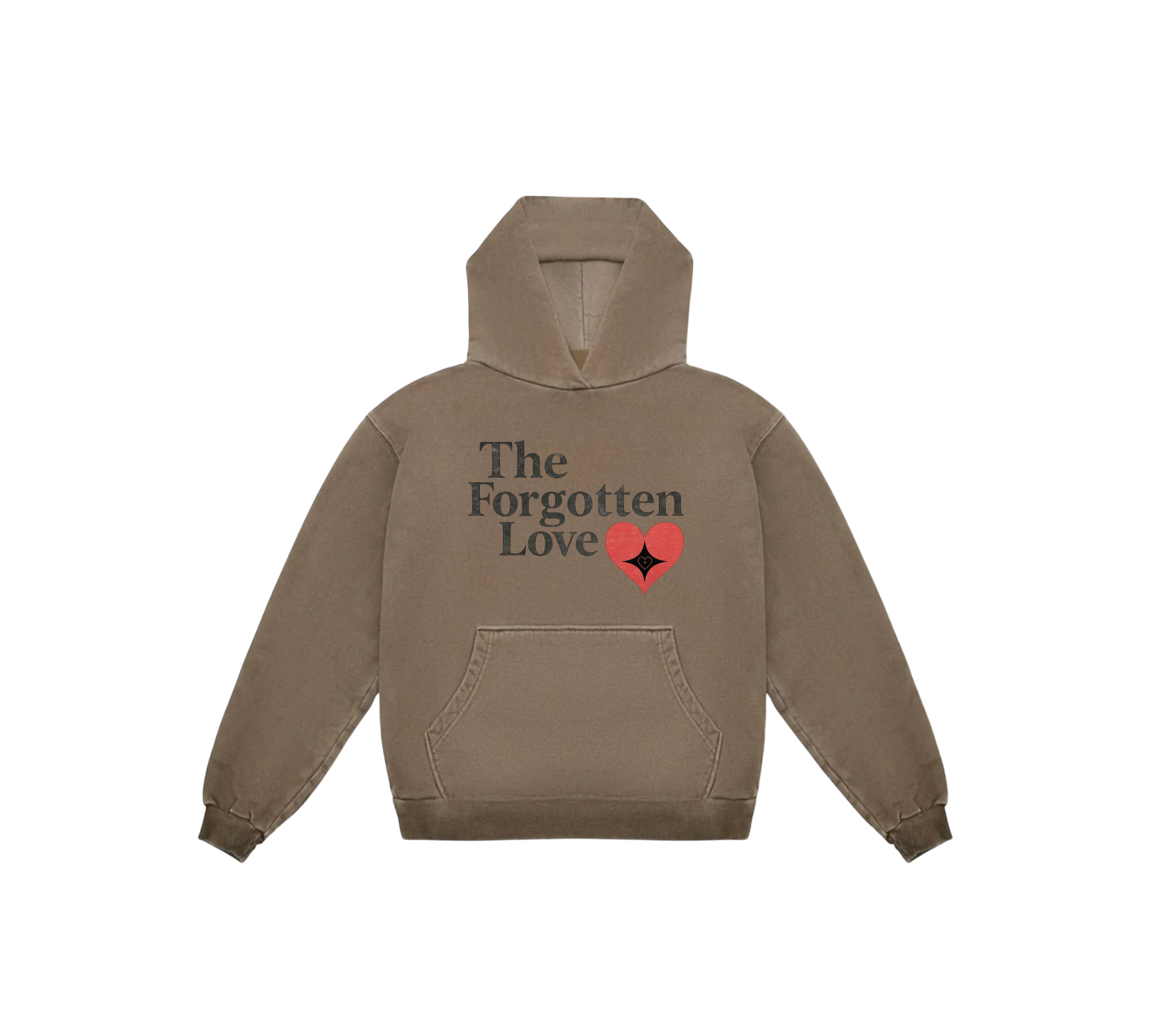 Crafted on a washed, vintage-taupe base, the hoodie carries The Forgotten Love wordmark in a bold, grounded serif. Beside it — a fractured red heart marked with the FRGTN symbol — a reminder that even the cracks become part of your story.
